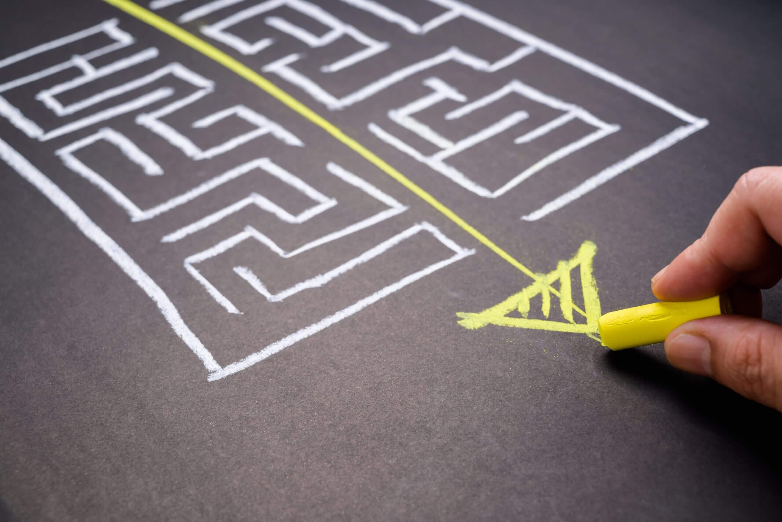 Hand draws solution to chalk maze.